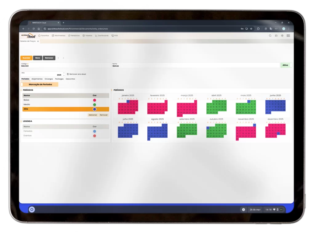 Visualização gráfica do calendário anual com os vários períodos (épocas), eventos e feriados diferenciados por cores.