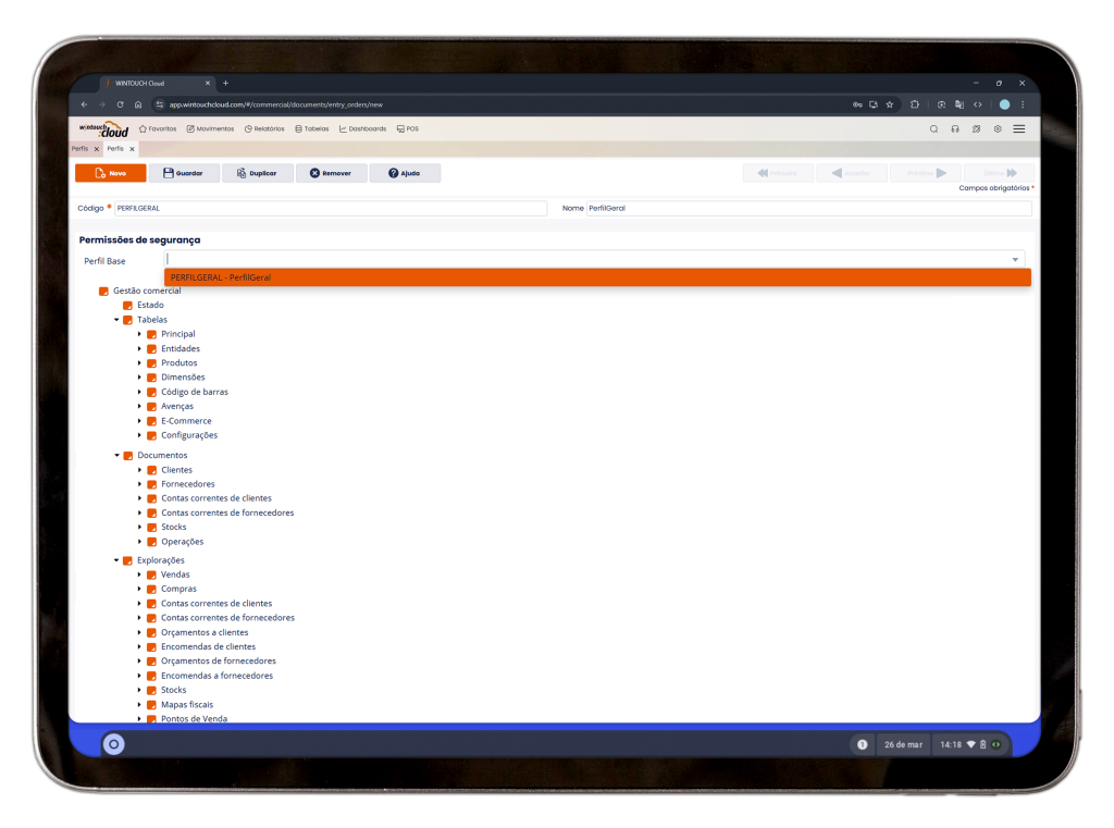 Definição de perfis de utilizador e funcionário, para gerir permissões de acesso à informação, funcionalidades e configurações;