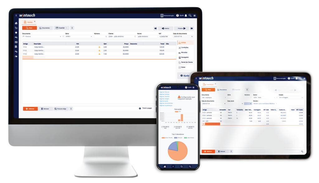 Intuitivo e fácil de começar a trabalhar, preparado para se ajustar às exigências e crescimento do seu negócio, evoluindo na utilização de novos modulo e novos utilizadores, a qualquer momento com total autonomia.