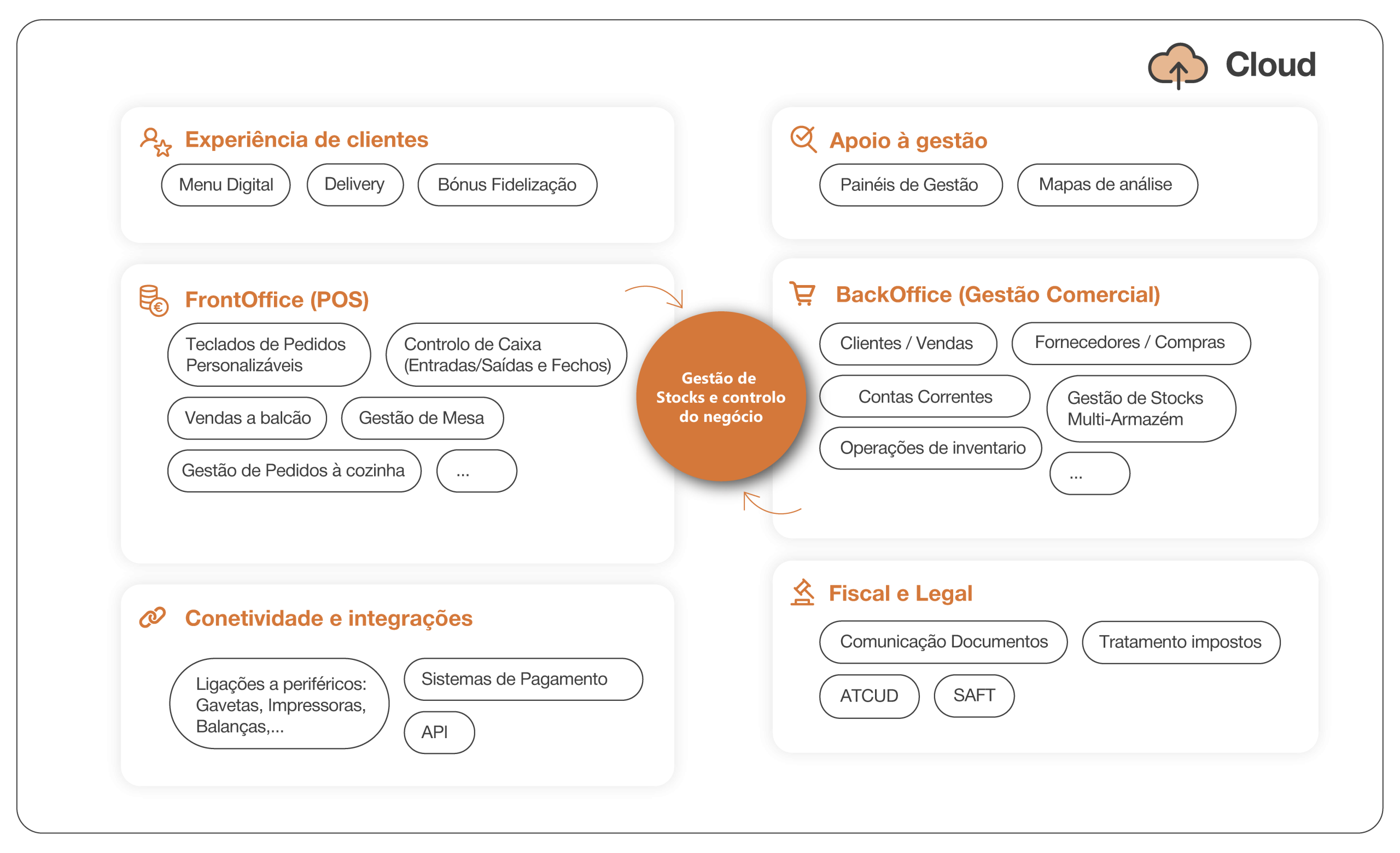 Uma solução Cloud evolutiva cuja sua cobertura funcional permite tratar as necessidades de diferentes estabelecimentos de restauração como: